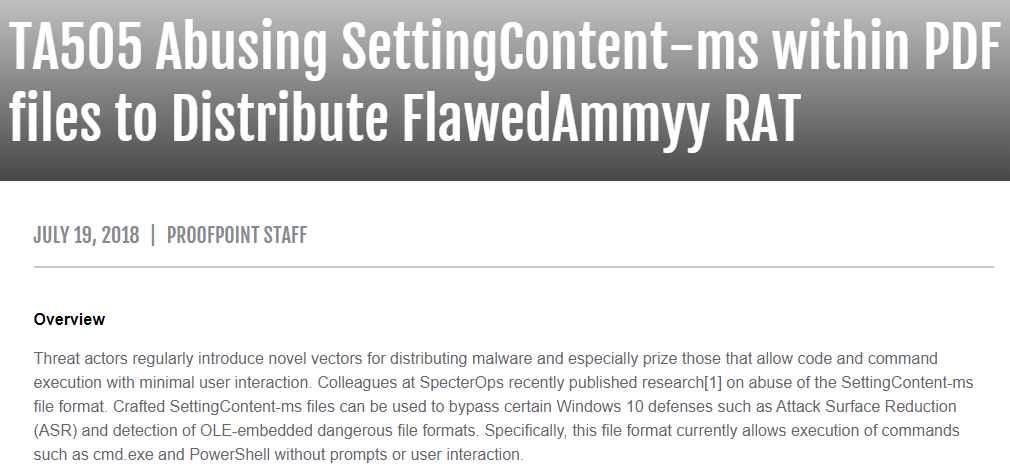 2018年通过大规模发送恶意邮件传播FlawedAmmyy恶意软件,邮件附件为内嵌SettingContent-ms文件的恶意PDF文档,文档被打开后SettingContent-ms文件中的PowerShell命令会下载并执行FlawedAmmyy恶意软件。