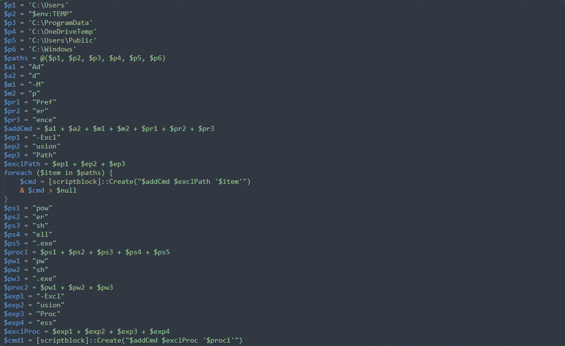 样本中还内置了 powershell 脚本将这些文件夹设置为 Defender 排除项。