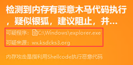 该案例涉及的加载器和注入器都是目前黑产和中低水平的 APT 组织常用的武器,六合引擎可以实现全流程监控和内存检测,当六合引擎在 explorer.exe 系统进程中检测到银狐特征后,会直接从内存中读取C2,并展示给用户,方便后续排查通报。