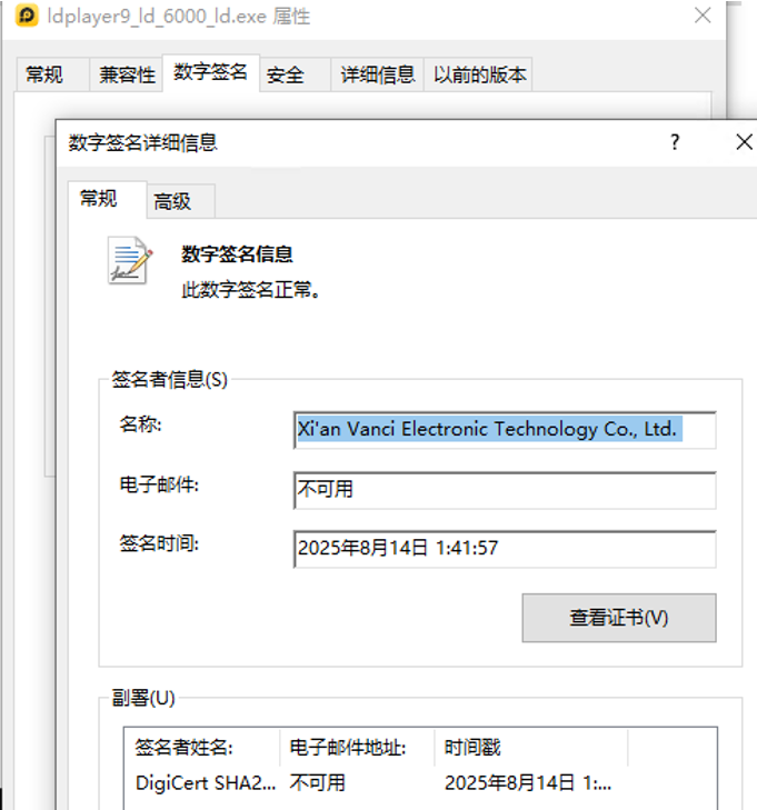 后续攻击者释放了一套白加黑组件,其中黑 DLL 带有另一个合法签名,同样触发了六合高级威胁引擎的告警后被我们发现: